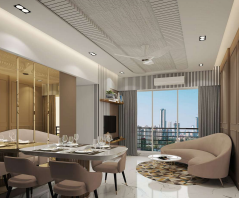 A full wall mirror panel behind the dining table, creating a spacious look.